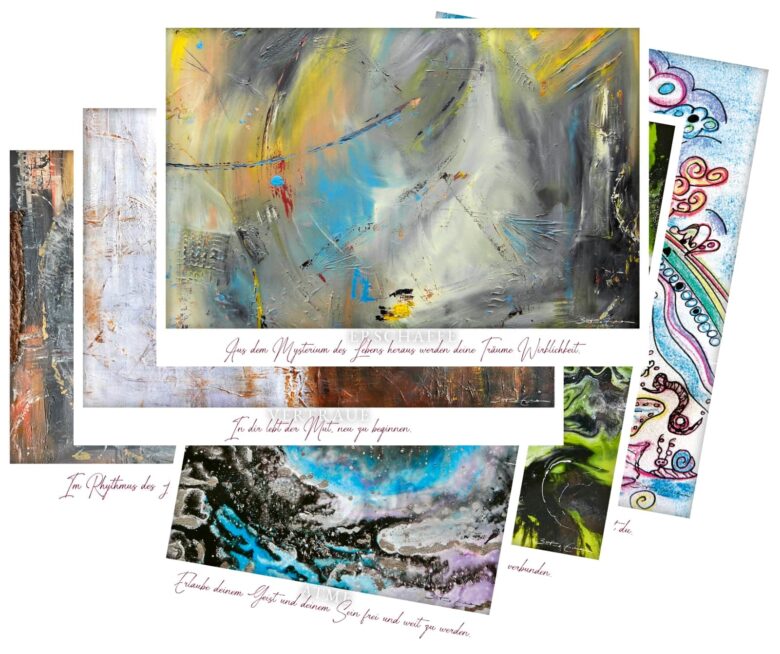 Jedes einzelne unserer wundervollen SD Karten Coverbilder hat seinen bildlichen Ursprung in einem einzigartigen Gemälde von Bettina Eicher. Durch das Ineinanderfließen der Farben und dem Lauschen der dazugehörigen Musik entstanden sechs intuitive Bilder. Die Symbiose aus kreativen Ausdrucksformen wie Malerei und Musik findet ihr in unseren SD Karten oder Klangei Sets. Ein Schriftzug magischer Poesie veredelt jeden einzelnen Druck und bringt die Energie in deine Räume.